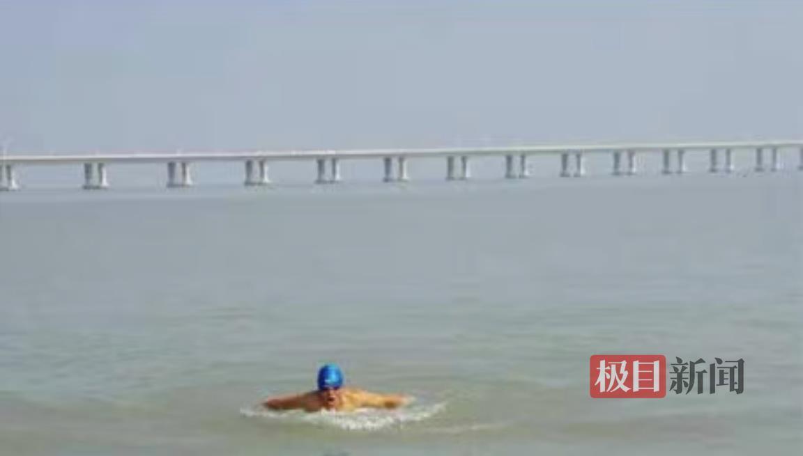 鲍政斌此前畅游长江入海口,背后是长达16公里的上海长江大桥(受访者供图)